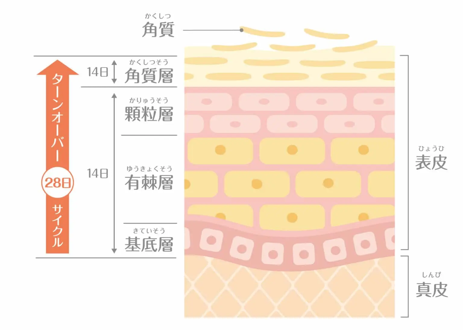 私たちの肌細胞は、常に生まれ変わっています。この肌の生まれ変わりの仕組みを「ターンオーバー(新陳代謝)」と呼びます。美しい肌を保つためには、肌のターンオーバーが正常におこなわれることがとても重要です。このサイクルが乱れるとくすみや乾燥、ニキビなどさまざまな肌トラブルを引き起こします。