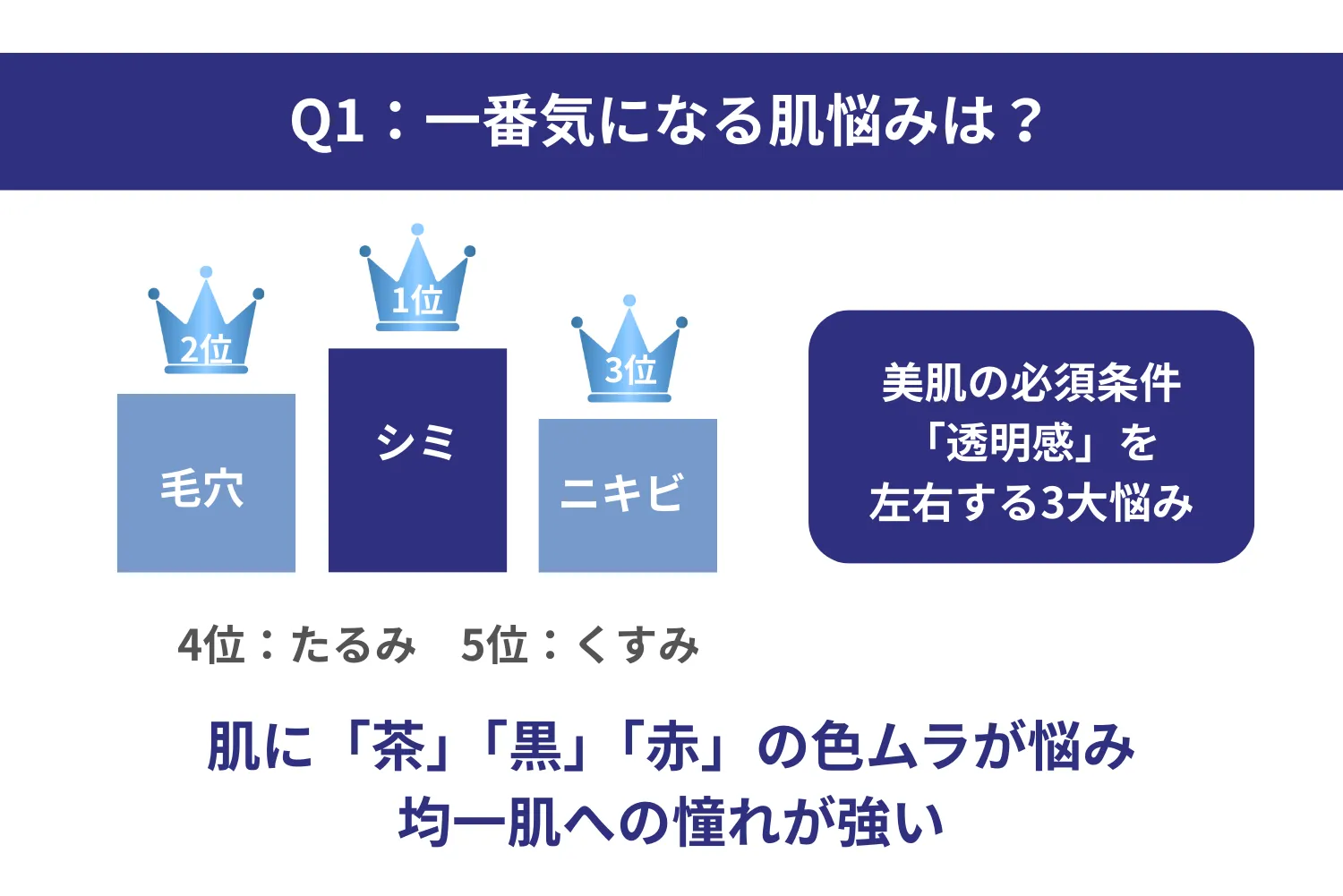 上位3つの「シミ」「毛穴」「ニキビ」は、美肌の必須条件である「透明感」を大きく左右する要素です。肌に「茶(シミ)」「黒(毛穴)」「赤(ニキビ)」といった色ムラがあることに悩み、これらを解消した「均一な肌」へ強い憧れを持っていることが浮き彫りになっています。
