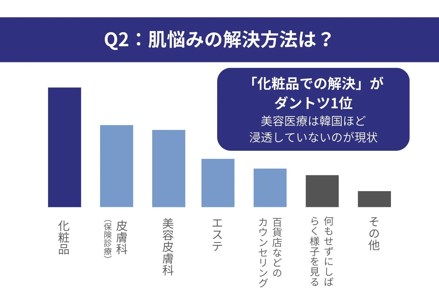 最も多い回答は「化粧品での解決」であり、他の選択肢を圧倒しています。「皮膚科」や「美容皮膚科」という選択肢も浸透しつつありますが、お隣の美容大国である韓国と比較すると、日本では医療機関を実際に選んでいる方はまだ少ないというのが実情です。