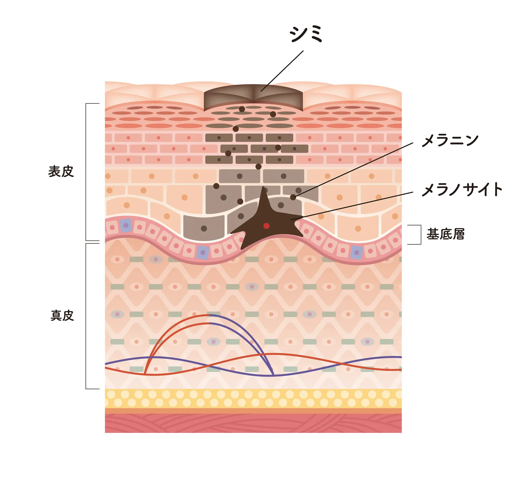 シミに影響を及ぼすメラニン(皮膚の色素)は、表皮の一番下、基底層にある「メラノサイト」という色素細胞で生成されます。メラノサイトがメラニン生成の指令を受けると、メラノサイトの中にあるチロシンというアミノ酸がチロシナーゼという酵素の働きにより、メラニンへと変化します。生成されたメラニンは、メラノサイトの周囲の表皮細胞(ケラチノサイト)に受け渡されて表層へ向かい、その後通常は肌のターンオーバーによって体の外へ排出されます。