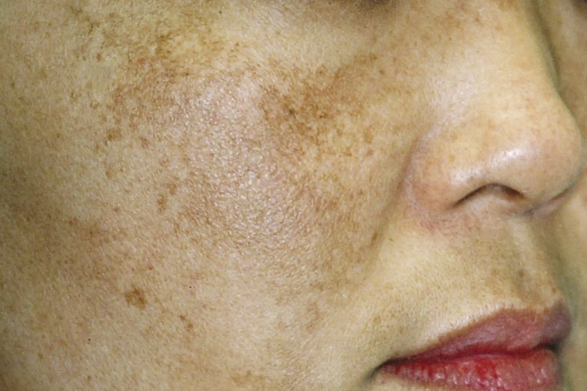 「肝斑(かんぱん)」とは、境界がはっきりせずさまざまな形状に広がるシミで、薄褐色から濃褐色に骨上や頬、鼻の下、額、口周りなどに左右対称に発生するのが特徴です。